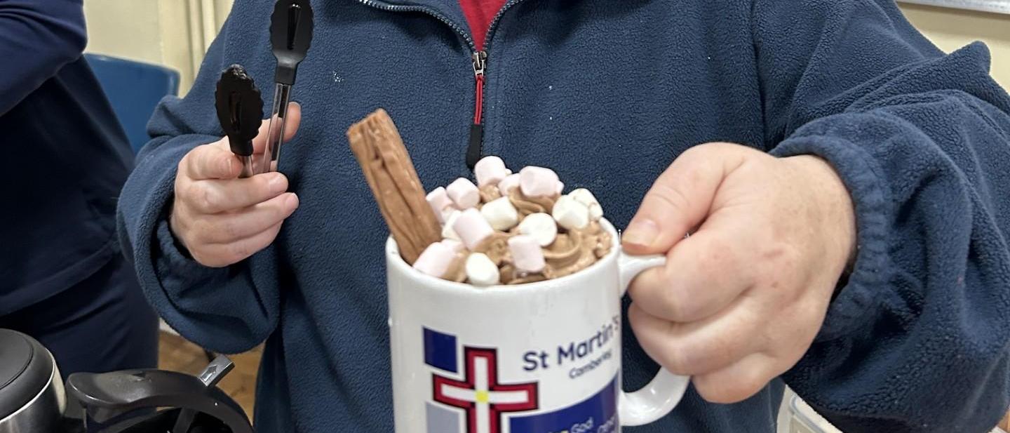 church volunteer holding a large hot chocolate with cream, marshmallows and a flake on top